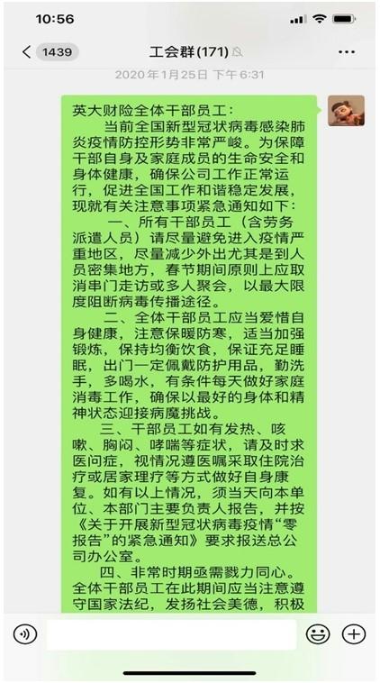 根據(jù)國網(wǎng)工會要求,我們擬定了《英大財險工會關(guān)于做好新型冠狀病毒疫情防控期間關(guān)心關(guān)愛職工的工作方案》,設(shè)立了專項資金用于疫情防控工作,關(guān)注職工心理健康,加強心理疏導和人文關(guān)懷,啟動職工訴求服務(wù)應(yīng)急響應(yīng)等工作。